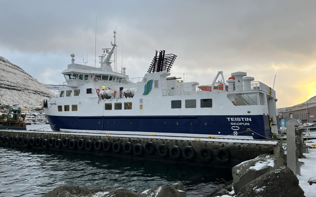 Teistin við bryggju í Klaksvík. Royndartíðin á kalsoyarleiðini er av.